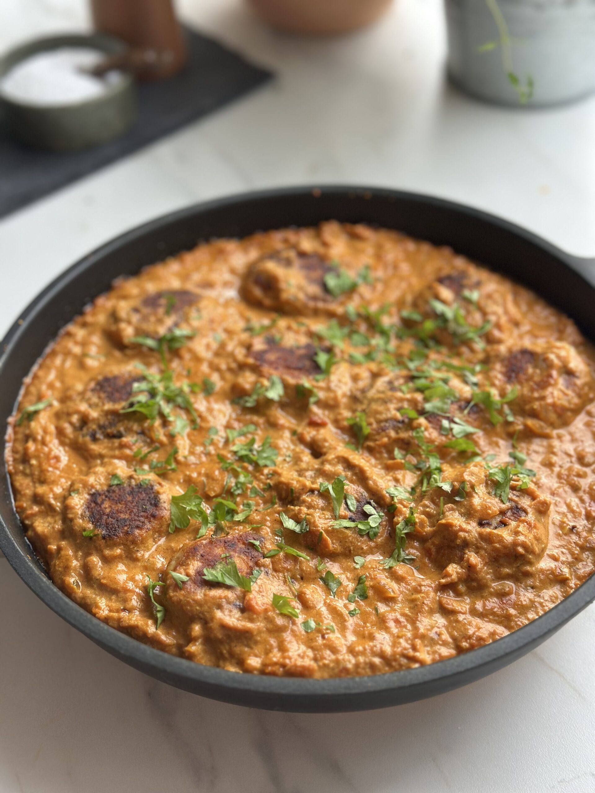De saftige kødboller er krydret med aromatiske krydderier, der passer perfekt til den cremede tomat- og flødesauce, som butter chicken er elsket for. Kombinationen af garam masala, spidskommen, koriander og ingefær giver dybde og varme til retten, mens fløde og smør gør saucen silkeblød og afrundet. Resultatet er en skøn fusion, hvor kødbollerne suger saucens krydderier til sig og gør retten endnu mere intens og indbydende.