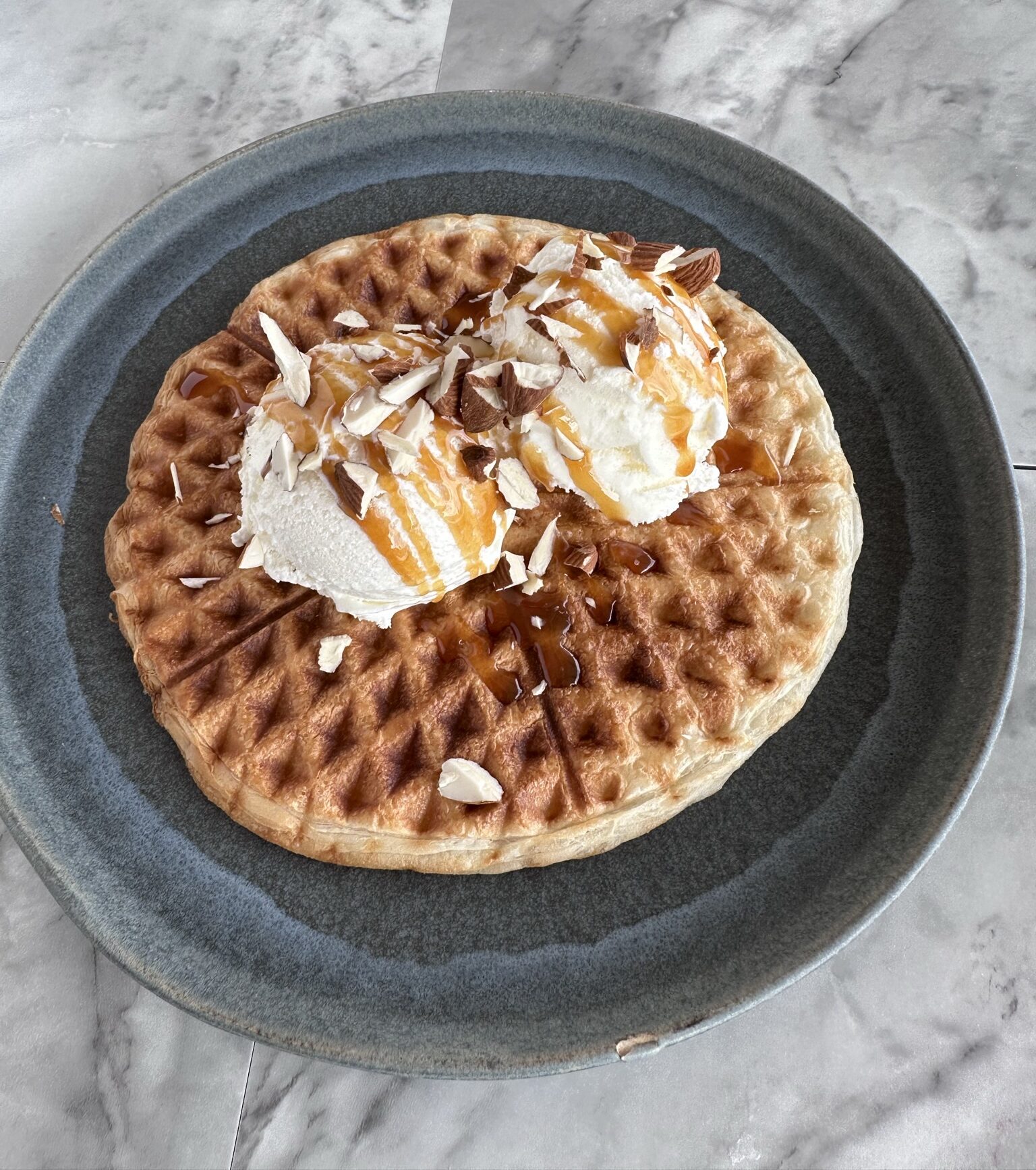 Sprøde, luftige butterdejsvafler toppet med cremet vaniljeis, sød karamelsauce og knasende hakkede mandler. Denne dessert er både nem at lave og fyldt med lækker smag – perfekt til en hurtig, men imponerende servering.