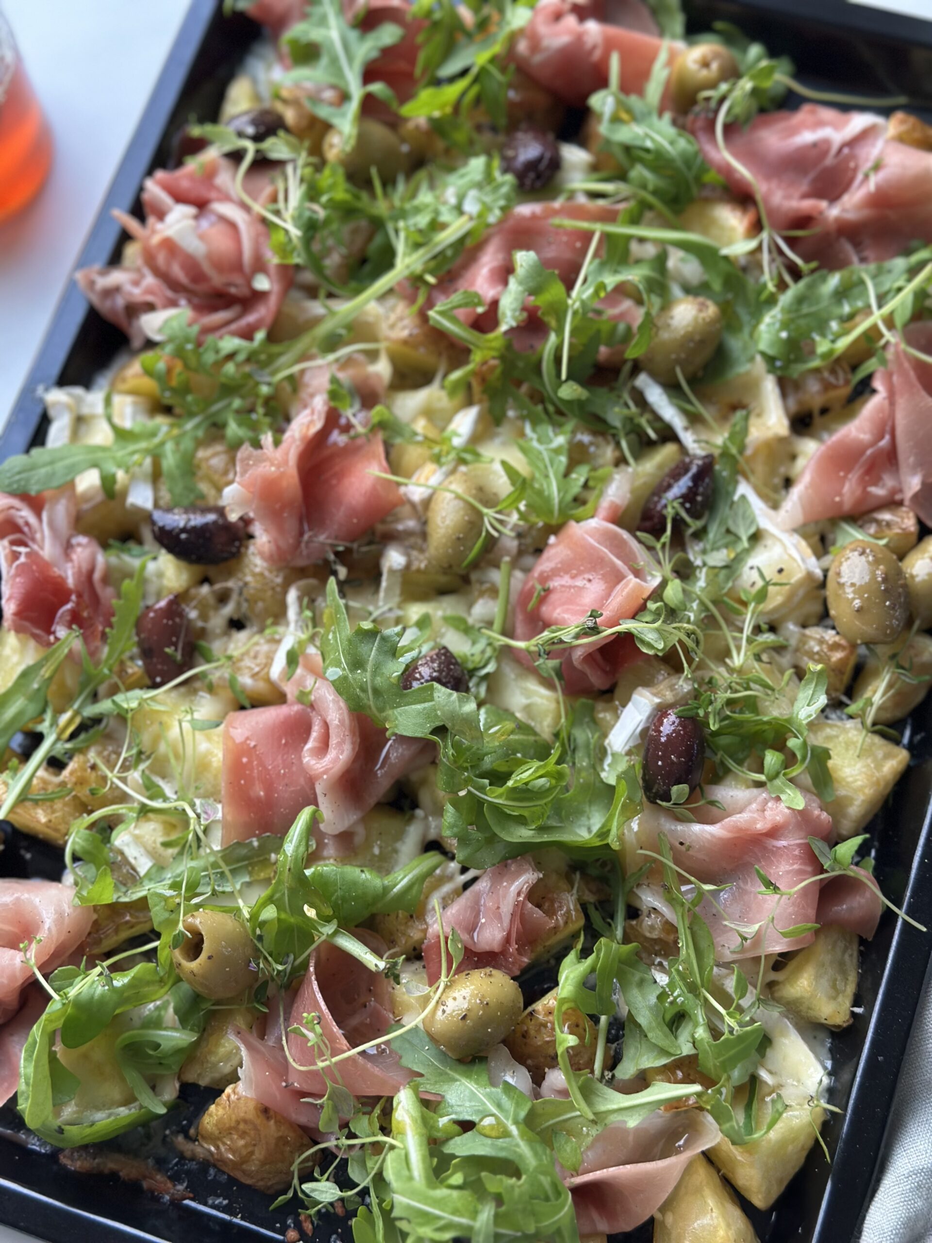 Denne opskrift er en sikker vinder, hvis du vil imponere dine gæster med en lækker og nem ret til tapasbordet, brunch eller en aften med lidt ekstra forkælelse. Kombinationen af sprøde ovnkartofler, smeltet brie og spicy honning giver det perfekte miks af salt, cremet og sødt med et lille spark. Den salte serranoskinke, friske rucola og oliven bringer charcuteri-stemningen helt i mål, og det hele er serveret direkte i ét fad, lige til at sætte på bordet. En ret der både er flot at se på og smager som en drøm.