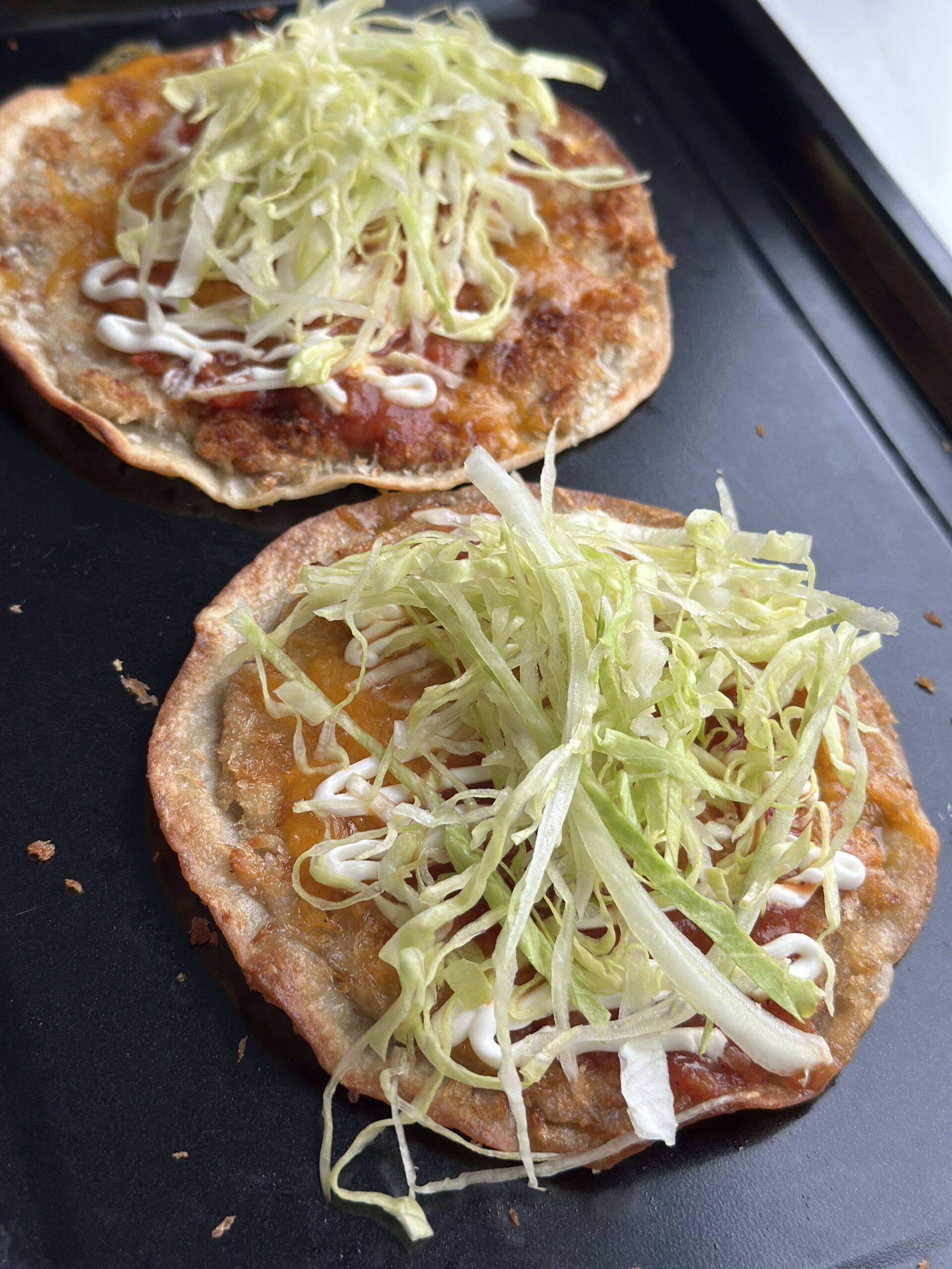 Top hver taco med en smule salsa, lidt mayonnaise og en håndfuld fintsnittet icebergsalat. Server straks, mens de stadig er varme og sprøde.