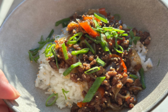 - Når dippen er klar, hæld den over i en skål og top med sprødt bacon, den grønne del af forårsløget og en lille smule sriracha for ekstra varme og smag.