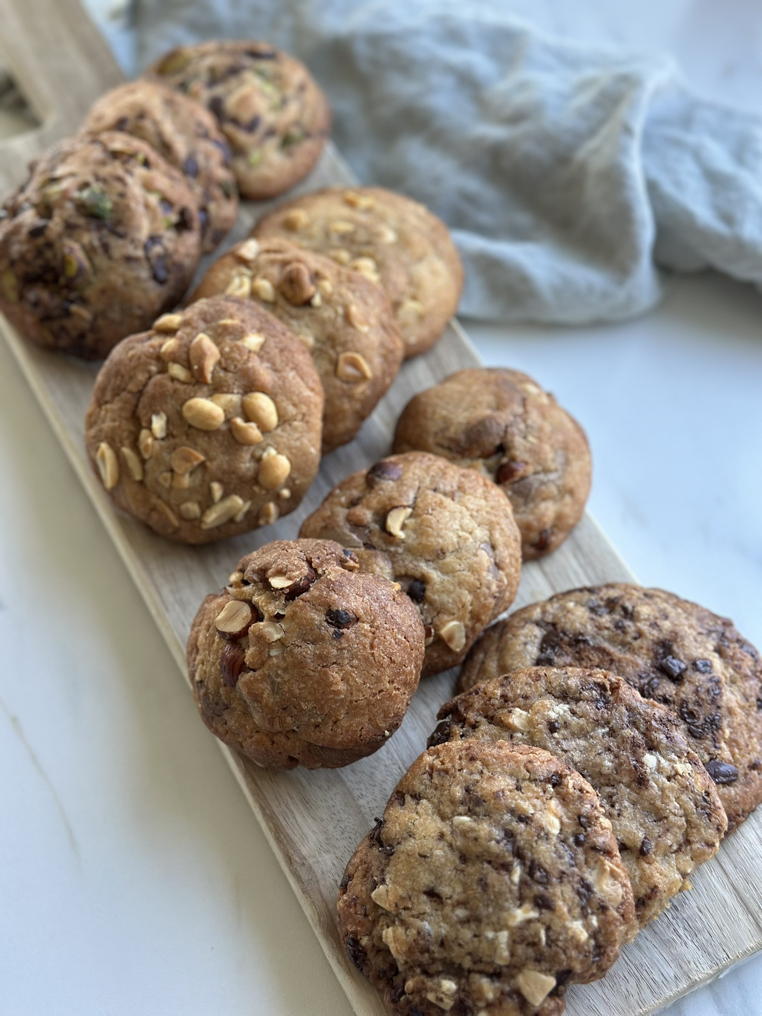 Grunddejen er en klassisk cookie-dej med smør, sukker og brun farin, som giver en blød midte og en let sprød kant. Når dejen deles i fire portioner, kan hver del få sin egen smag. I denne version får du cookies med peanuts og biscoff, en klassisk udgave med mørk og hvid chokolade, en variant med pistacie og chokolade samt en cookie med hasselnødder og nougat. Det giver fire forskellige cookies med samme base, men med helt forskellige smagsoplevelser.