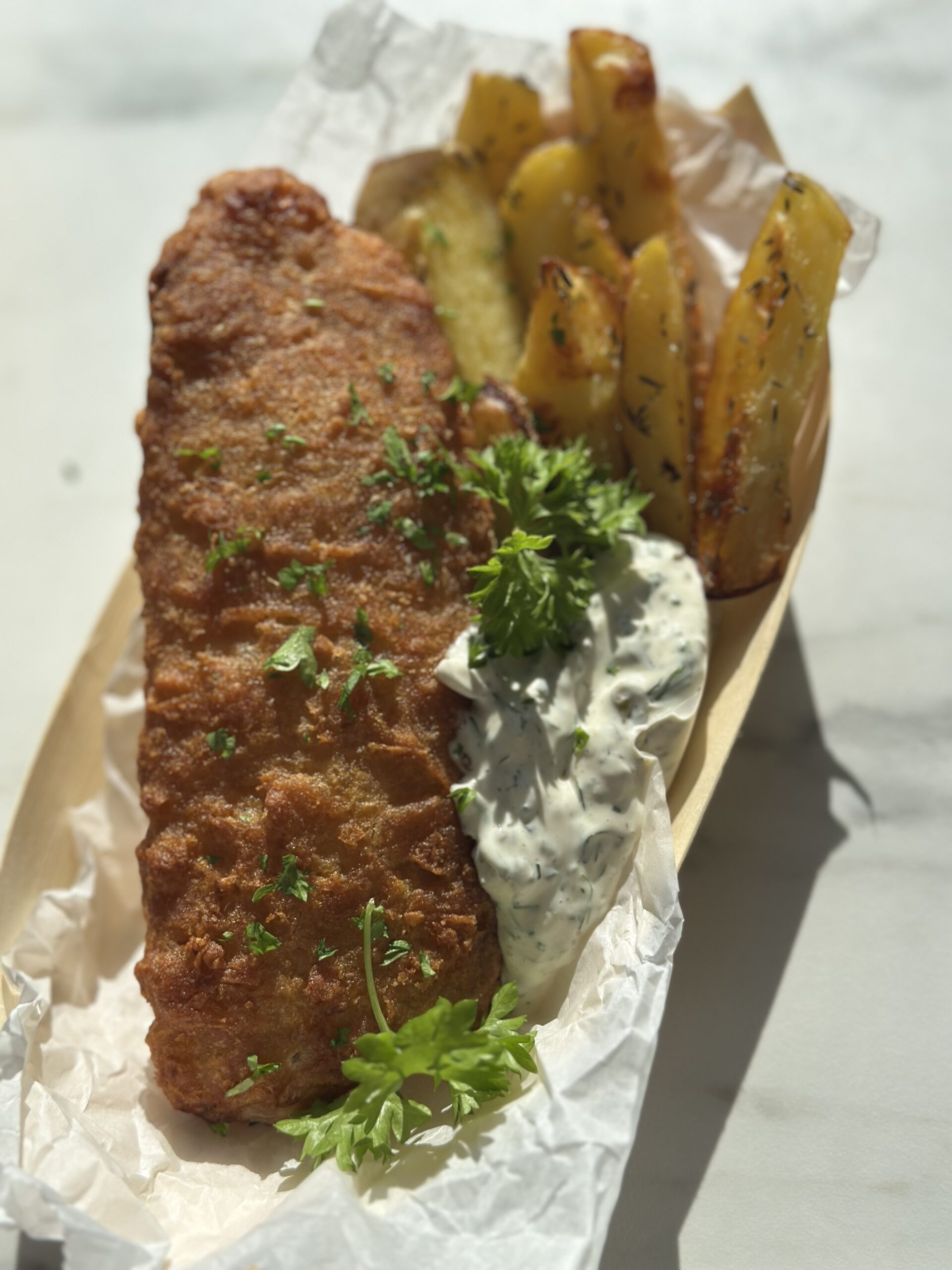 Fish’n’chips med tatarsauce er en britisk klassiker, der med få justeringer passer perfekt ind i det danske køkken. Her får du en nem og sprød version, hvor kartoflerne bages i ovnen i stedet for at blive friturestegt, og fisken tilberedes fra frost, hvilket gør retten hurtig og overskuelig – også på en hverdagsaften. Tatarsaucen er hjemmelavet og løfter hele retten med sin syrlige, cremede og urtede smag, der passer perfekt til både fisk og kartofler.