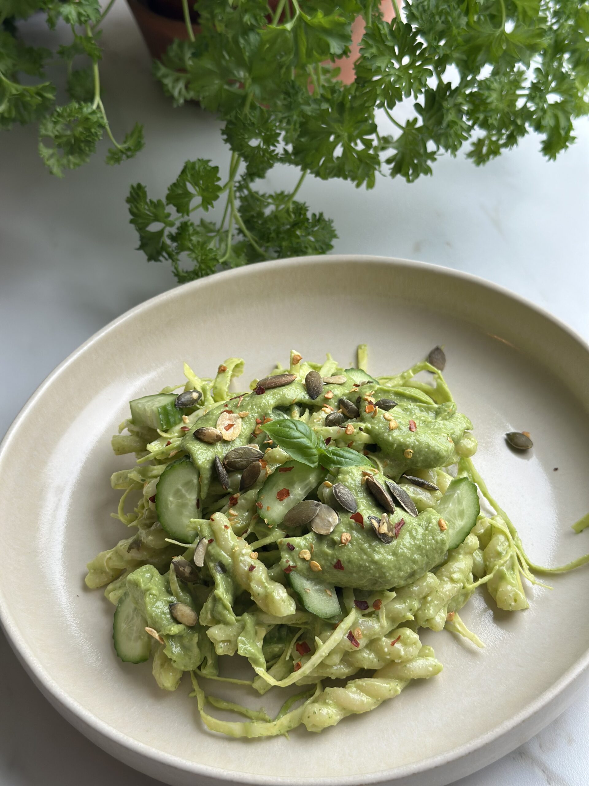 Salaten kombinerer kogt pasta med fintsnittet spidskål, agurk og en cremet avocado-baseret dressing. Cashewnødderne giver fedme og lidt ekstra dybde, mens parmesan og citron tilfører friskhed og syre. Toppingen med saltede græskarkerner og et drys tørret chili giver lidt ekstra bid og gør salaten komplet. Det er en opskrift, der både er hurtig at lave og nem at variere, alt efter hvad du har i køkkenet.