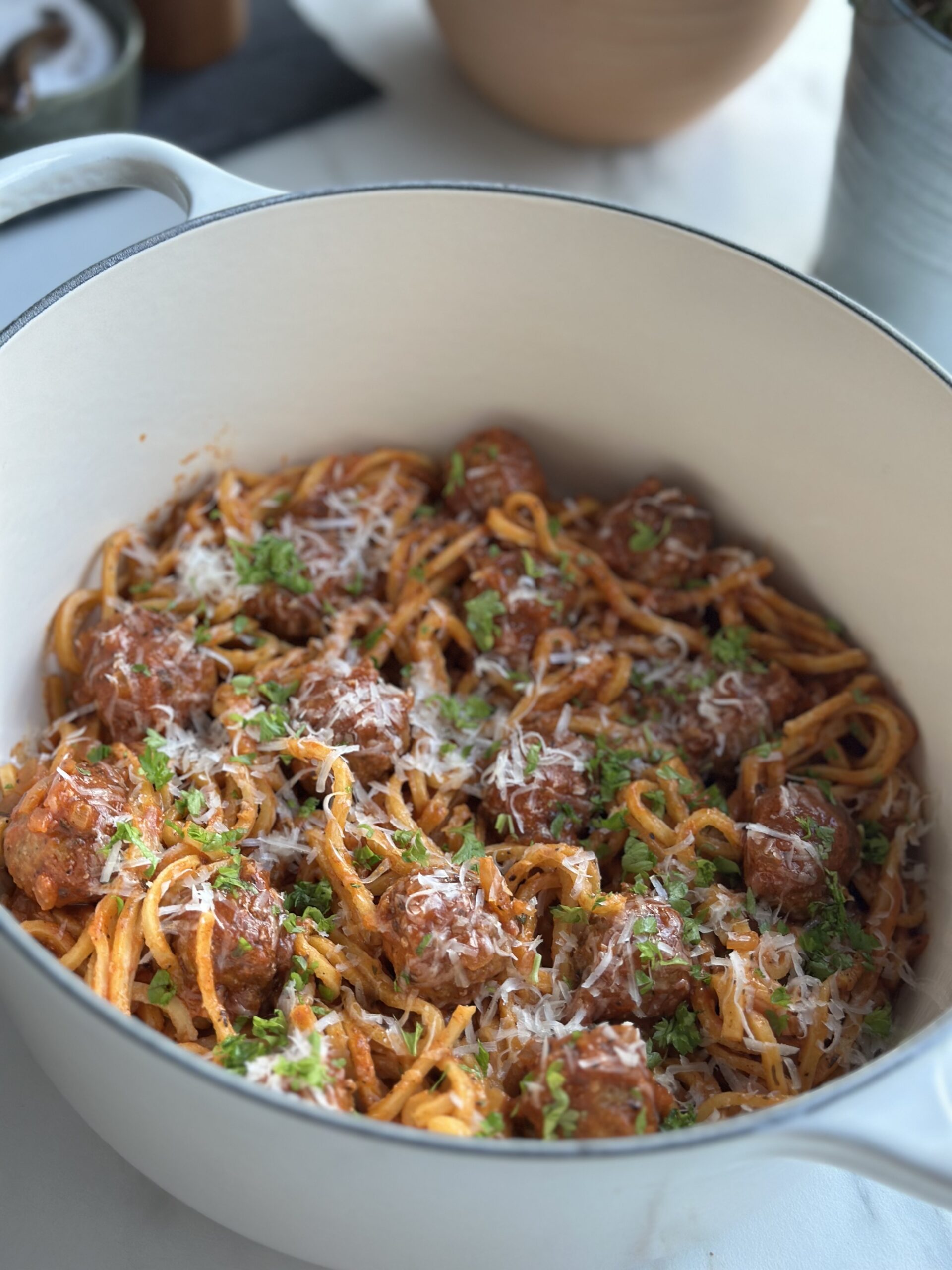 Italienske kødboller i tomatsauce serveret med spaghetti er en vaskeægte klassiker, som hele familien elsker. Den saftige fars med krydderurter og fløde gør kødbollerne ekstra bløde og smagfulde, og den hjemmelavede tomatsauce er både sød, krydret og dyb i smagen. Det er en ret, der både fungerer som hyggelig hverdagsmad og som lidt ekstra lækkert i weekenden – især når man serverer den med friskkogt spaghetti og et drys parmesan.