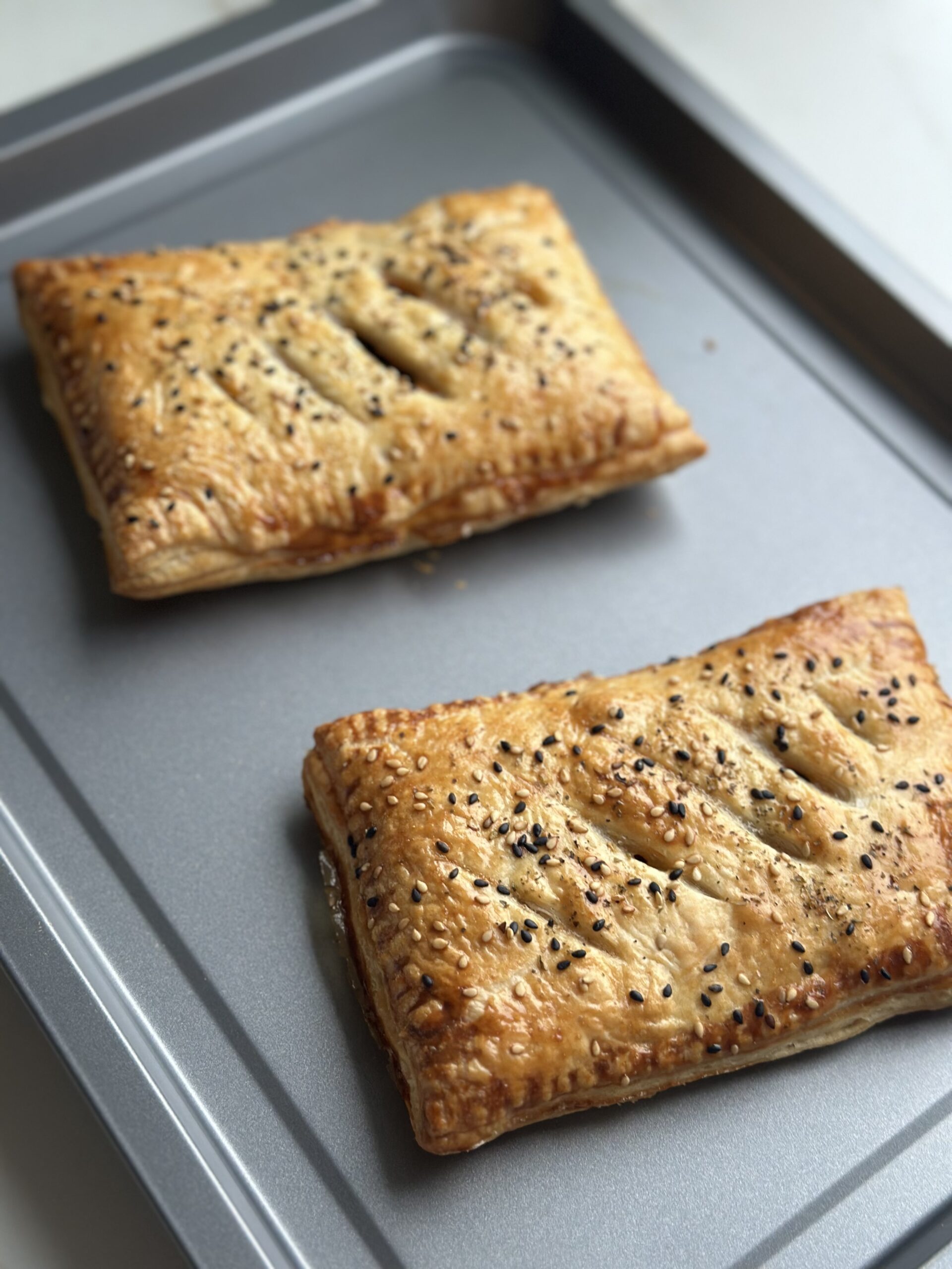 Pensl med sammenpisket æg og drys med sesam. Bag ved 180 grader varmluft i ca. 20 minutter, til butterdejen er gylden og sprød.