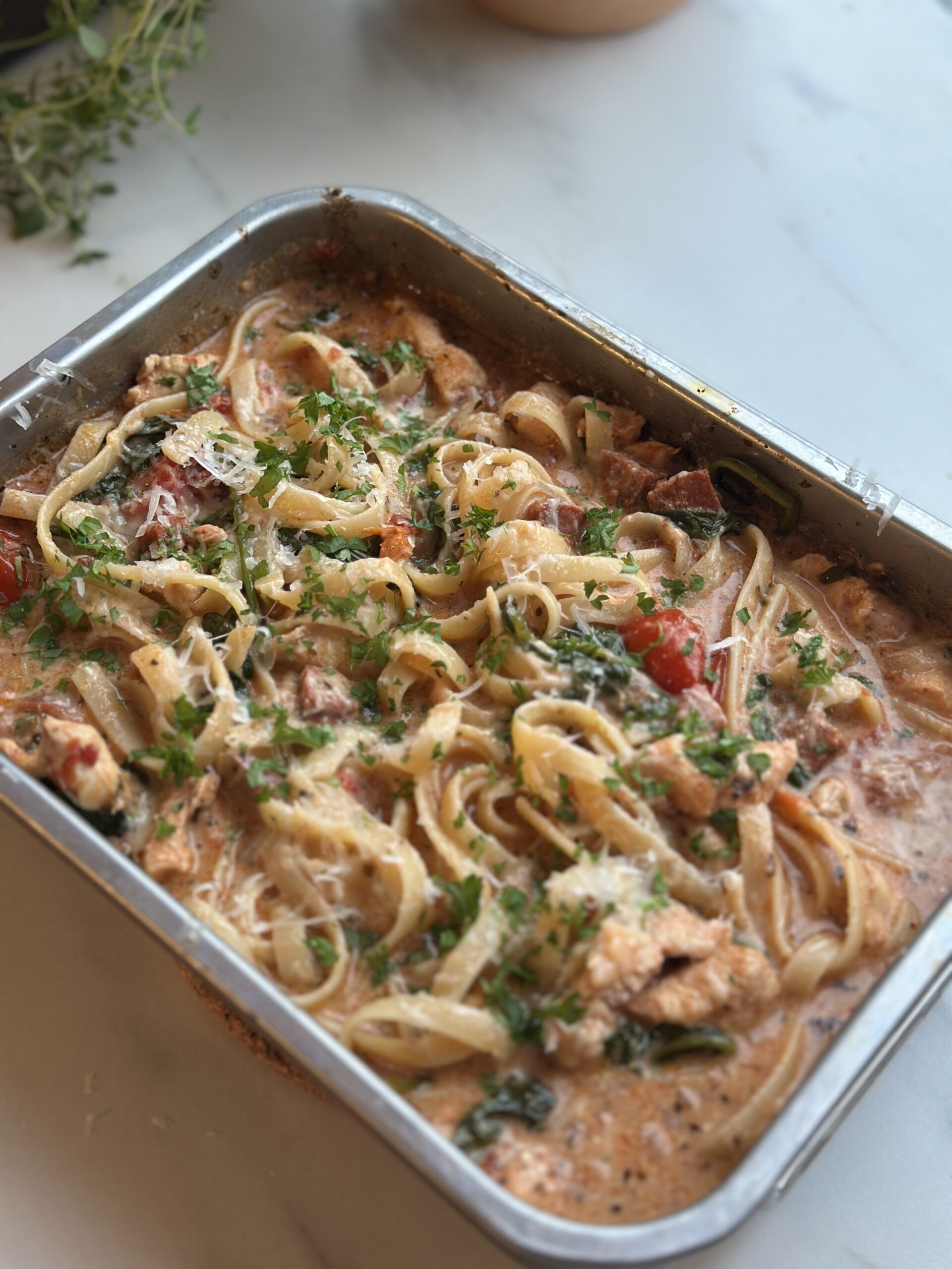 Du kan lave retten med den pasta, du har, og justere mængderne efter, hvor mange I er. Det hele passer sig selv i ovnen, og du får en fuld ret med både kød, grønt og sauce, som kan serveres direkte fra fadet. Det gør den oplagt både til hverdagsmad og som nem gæstemad. Den er også velegnet til at forberede i god tid og varme op senere – og smagen bliver kun bedre.