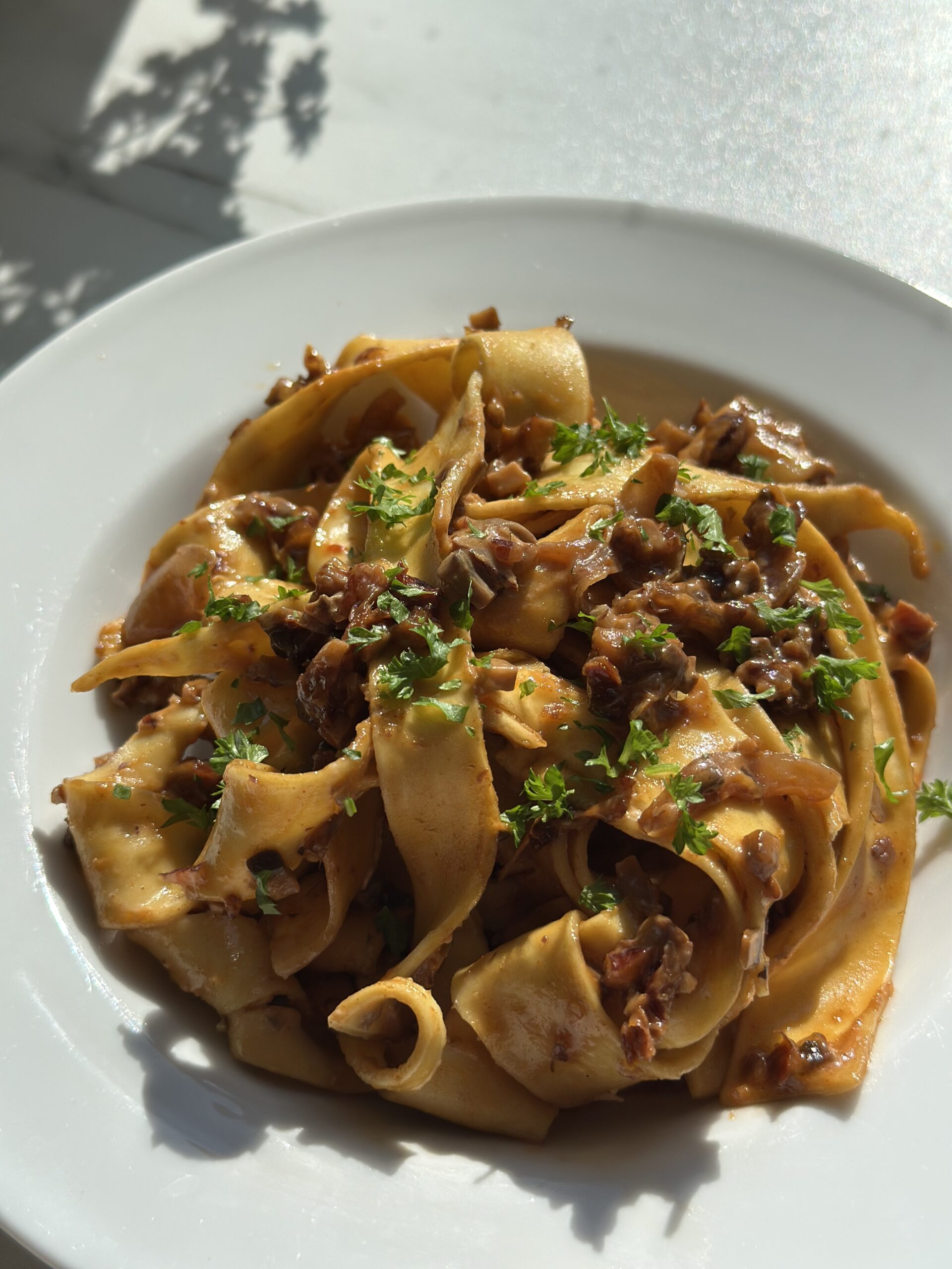 Retten tager udgangspunkt i ganske få ingredienser, men smagen bliver kompleks og tilfredsstillende. Den karamelliserede løgbase, som koges sammen med soya, sirup og worcestershiresauce, giver en fyldig bund, som binder hele retten sammen. Svampene og de soltørrede tomater tilfører umami og syre, mens de ristede pekannødder giver knas og dybde. Den kan laves med både pappardelle eller friske lasagneplader skåret i brede strimler – alt efter hvad du har. Servér den som et hyggeligt hverdagsmåltid eller som en let, men imponerende weekendret.