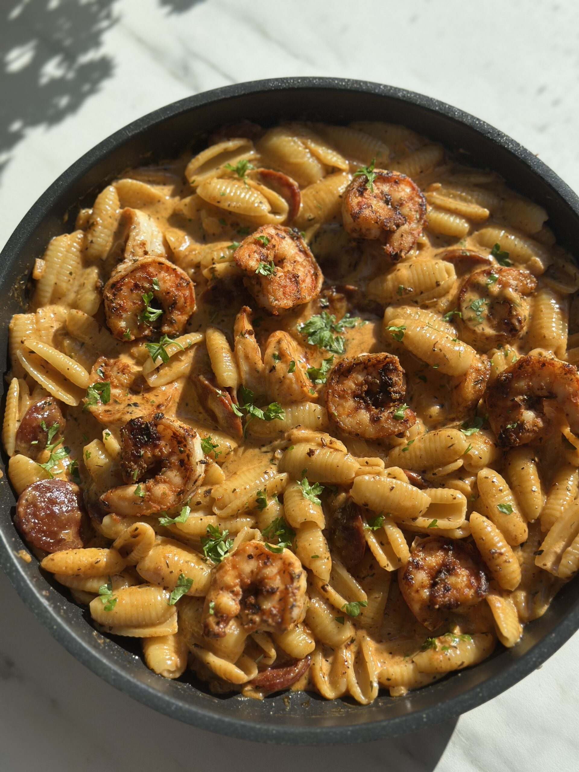 Chorizoen giver både smag og fedme til saucen, mens rejerne får en let marinering i krydderier, som gør dem ekstra velsmagende og saftige. Kombinationen af paprika, hvidløgspulver, timian og citronsaft giver saucen både fylde og syre, mens mozzarellaen gør retten ekstra cremet. Den friske persille til sidst giver et let grønt løft, der afrunder retten. Det er en ret, der både mætter og imponerer – uden at være svær.