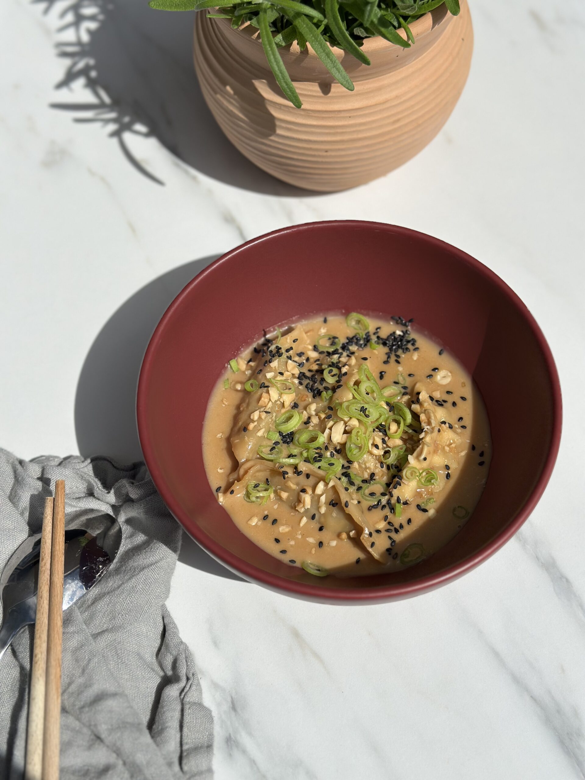 Peanutbutter dumplingsuppe er en nem og smagfuld suppe, som kombinerer asiatisk-inspirerede ingredienser med en cremet base, der både mætter og varmer. Suppen har en rund og let sød smag fra peanutbutter og kokosmælk, balanceret med lime, soya og et strejf af sukker. Det er en ret, der føles som comfort food – men med et lille twist. Dumplingsene giver bid og fylde og gør suppen til et måltid i sig selv, mens toppingen med forårsløg, peanuts og sesam tilføjer friskhed og lidt knas.