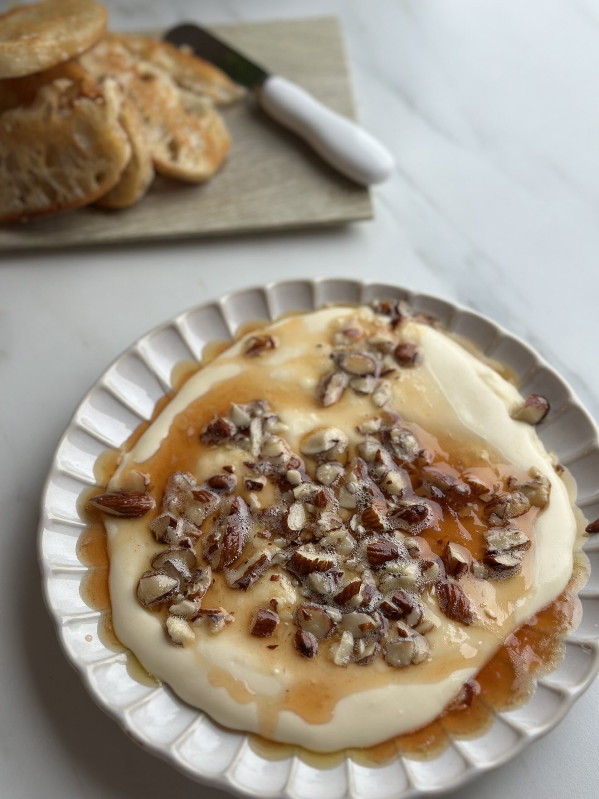 Fordel den piskede brie på et lille fad eller en tallerken. Top med de smørstegte mandler og dryp generøst med hot honey. -