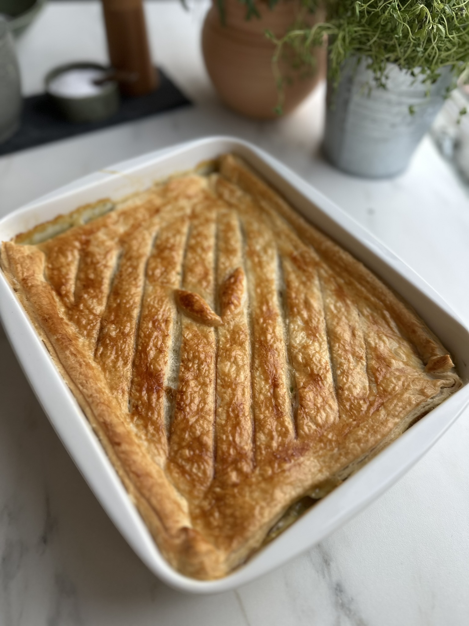 En af de store fordele ved denne kyllingetærte er, at den både er enkel at lave og samtidig ser imponerende ud på bordet. Den sprøde butterdej giver en flot kontrast til den cremede fyldning, og retten kan serveres direkte fra fadet, så alle kan tage et stykke. Med sin kombination af kylling, grøntsager og sauce er tærten et helt måltid i sig selv, men den passer også rigtig godt sammen med en frisk grøn salat, en skål dampede grøntsager eller måske lidt ovnbagte kartofler for et ekstra mættende måltid.