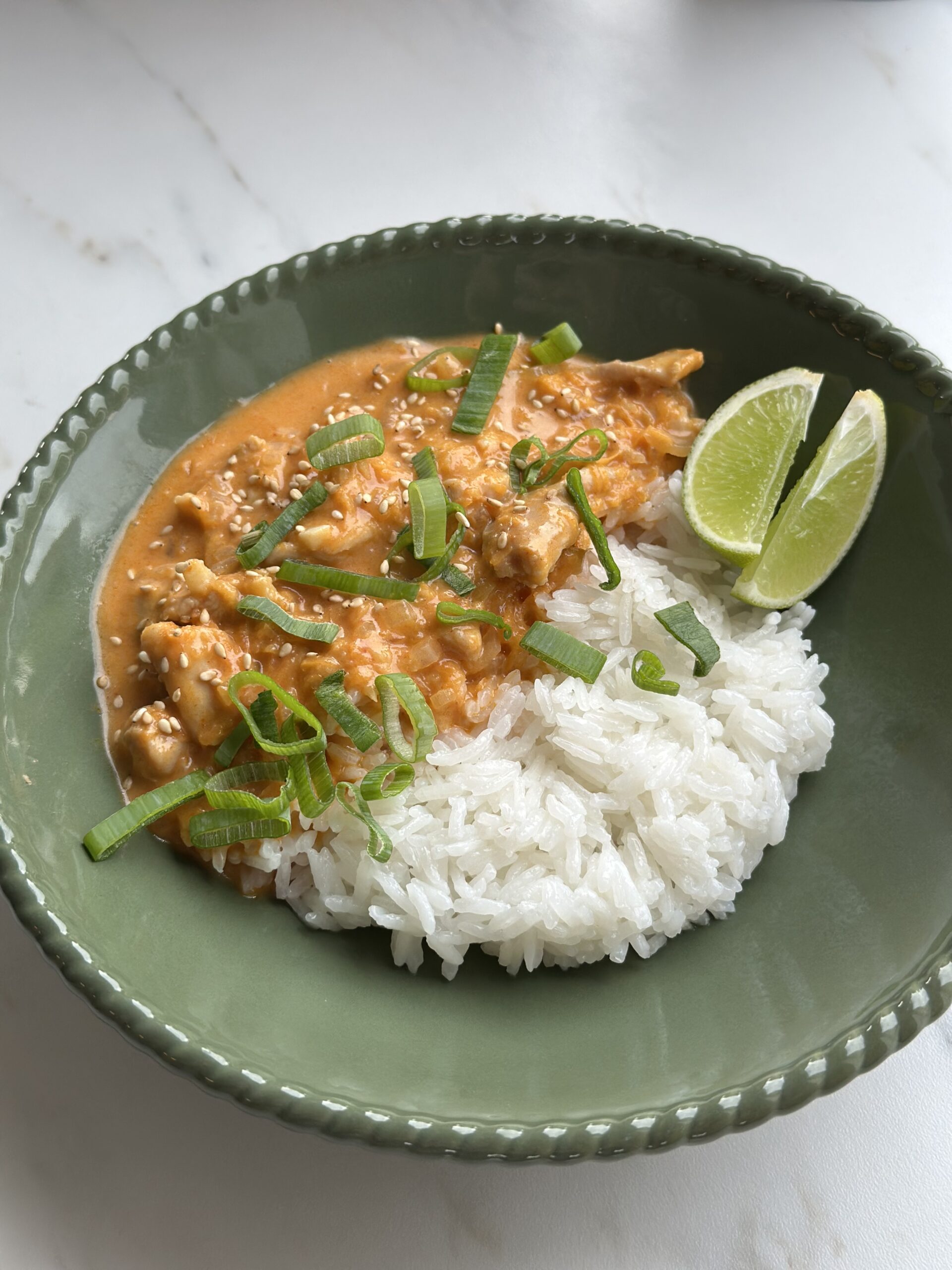 Rød kokos-lime kylling er en smagfuld og cremet hverdagsret med varme fra krydderierne, friskhed fra lime og sødme fra kokosmælken. Kombinationen af den bløde kokosmælk, det aromatiske ingefær og den syrlige lime giver en intens og afbalanceret sauce, som klæder kylling og ris virkelig godt. Retten er nem at lave, og den kan sagtens justeres i styrke, alt efter hvilken karrypasta du bruger – så den passer til både børn og voksne.