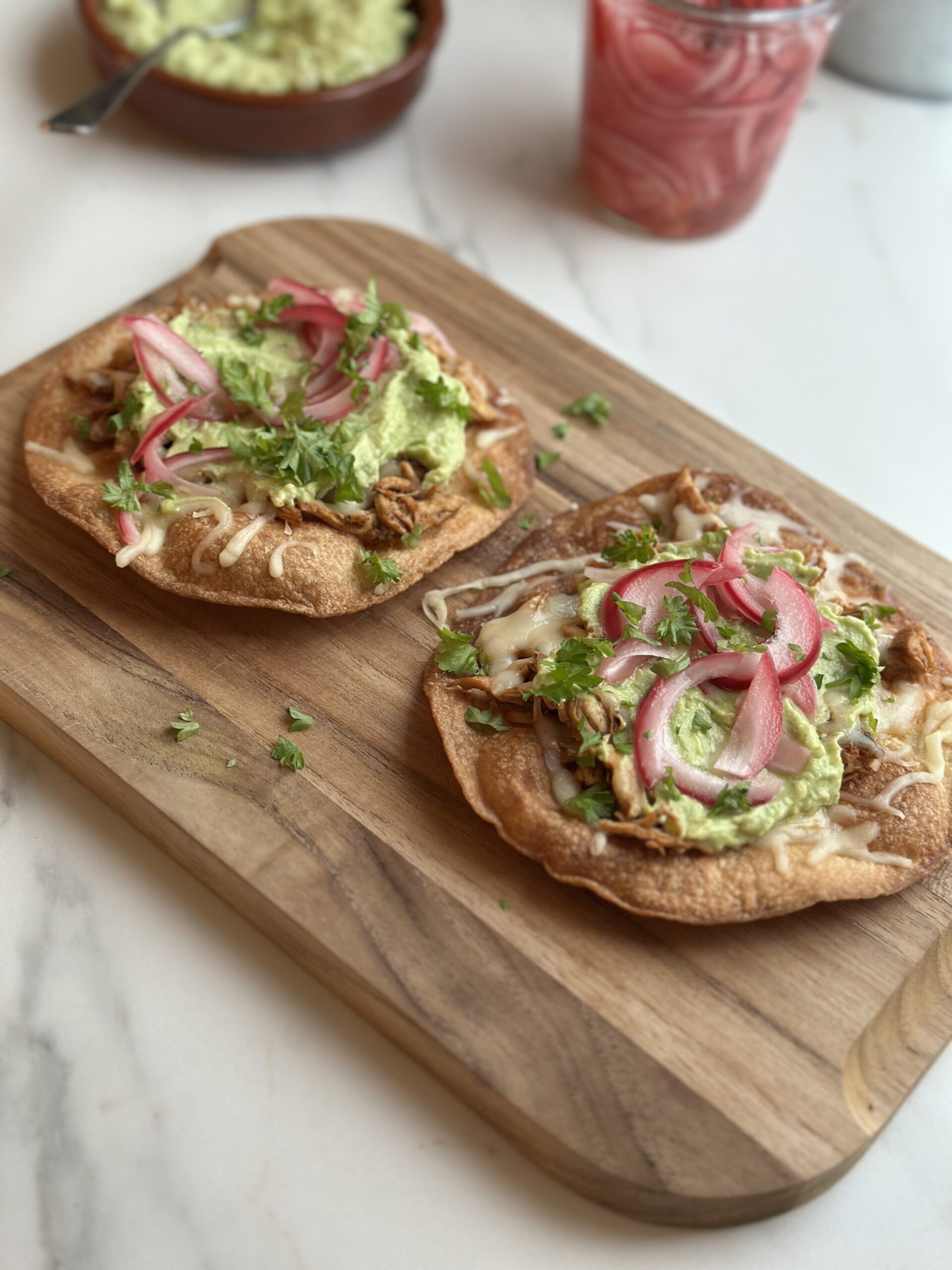 Det, der gør tostadas så populære, er netop kombinationen af det sprøde underlag og de mange lag af fyld. Den krydrede pulled chicken er marineret og tilberedt, så den bliver mør og fuld af smag, mens avocadocremen giver en blød og frisk kontrast. De syltede rødløg tilføjer syre, som balancerer de fyldige elementer, og sammen skaber det en bid, der både er frisk, krydret og tilfredsstillende.
